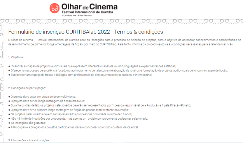 O CURITIBAlab é o laboratório de desenvolvimento de projetos do Olhar de Cinema – Festival Internacional de Curitiba, voltado exclusivamente para projetos de primeiros longas-metragens de ficção em desenvolvimento. A grande proposta do laboratório é se consolidar como um espaço de escuta, troca e construção de conhecimentos para quem está começando no universo dos longas-metragens. Seis projetos brasileiros de primeiro longa-metragem de ficção serão selecionados para receber, ao longo de 4 dias, consultorias com profissionais do cinema de destaque no cenário nacional e internacional.